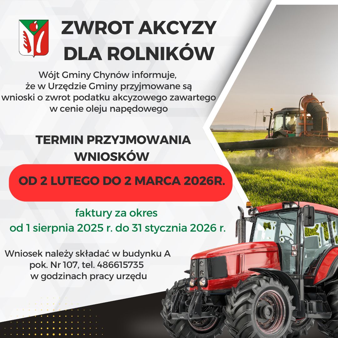 w terminie od 2 lutego 2026 r. do 2 marca 2026 r. należy złożyć wniosek do wójta,w zależności od miejsca położenia gruntów rolnych wraz z fakturami VAT stanowiącymi dowód zakupu oleju napędowego w okresie od 1 sierpnia 2025 r. do 31 stycznia 2026 r.,
