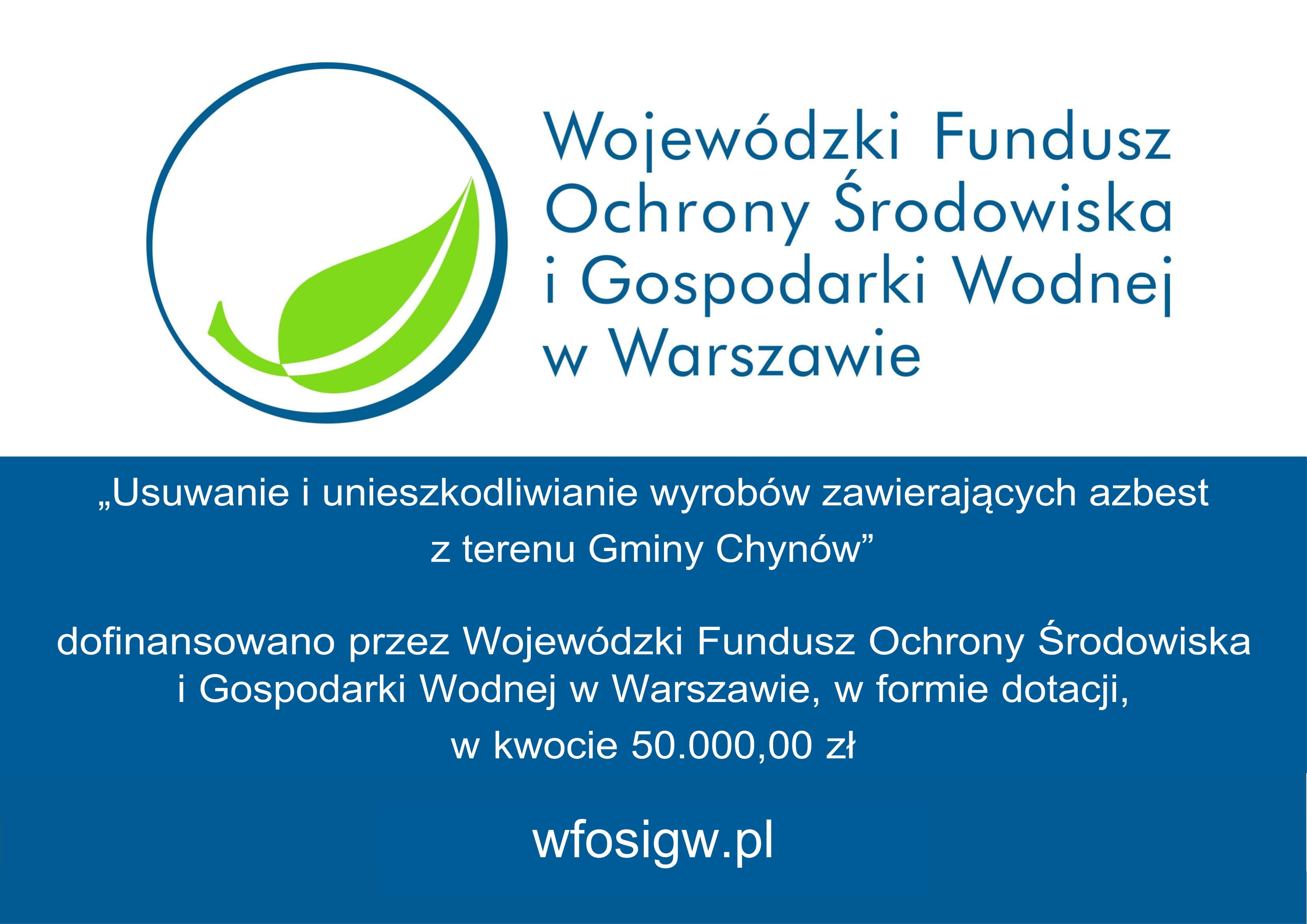 W dniu 10 września 2025 r. Gmina Chynów i Wojewódzki Fundusz Ochrony Środowiska i Gospodarki Wodnej w Warszawie podpisały umowę na dofinansowanie zadania „Usuwanieunieszkodliwianie wyrobów zawierających azbest z terenu Gminy Chynów”. Dofinansowanie wyniesie do 50.000,00 zł. W ramach zadania planowany jest odbiór 140 ton wyrobów azbestowych.
